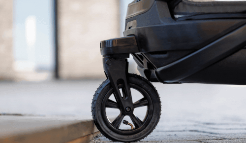 Luftgefülltes Schaufelrad mit Federung und Richtungssicherung – gleitet problemlos unter den Kinderwagen, wenn er nicht benutzt wird.