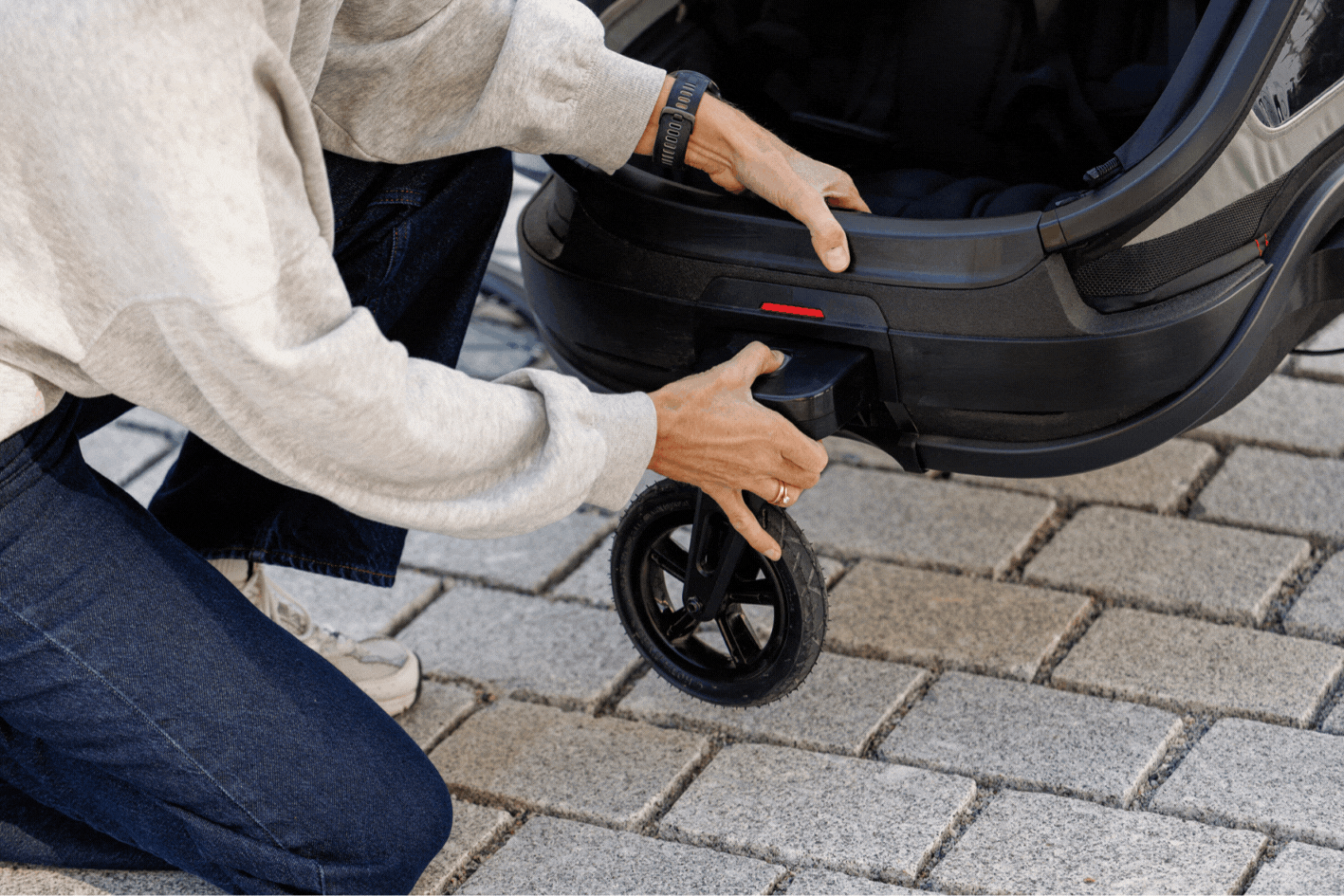 Cocoon and Breeze have an integrated brake on the handlebar. Outback has a brake when the terrain wheel is mounted, while Outback Next can be equipped with a disc brake kit used together with the terrain wheel for jogging.
