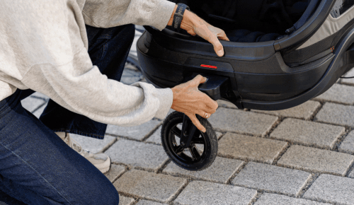 Changement de mode sans effort – roue de pousette rangée sous la remorque